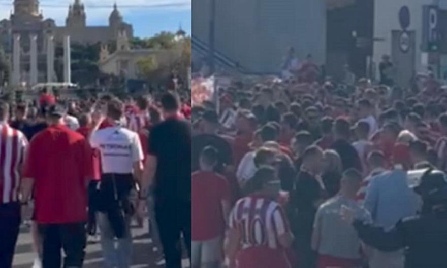 Οι φίλοι του Ολυμπιακού στηρίζουν κατά χιλιάδες την ομάδα του Χοσέ Λουίς Μεντιλίμπαρ στην εκτός έδρας δοκιμασία με την Μπαρτσελόνα στη Βαρκελώνη.
