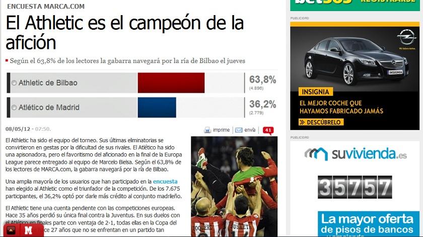 Προσμετρώντας όλα τα παραπάνω οι αναγνώστες της ιστοσελίδας της ισπανικής εφημερίδας «Marca» αποφάνθηκαν πως η Μπιλμπάο κατά 63,8% θα «σηκώσει» το τρόπαιο στον ουρανό της ρουμανικής πρωτεύουσας αύριο το βράδυ, ενώ το υπόλοιπο 36,2% θεωρεί πως θα καταλήξει στη Μαδρίτη και όχι στη Βασκονία.