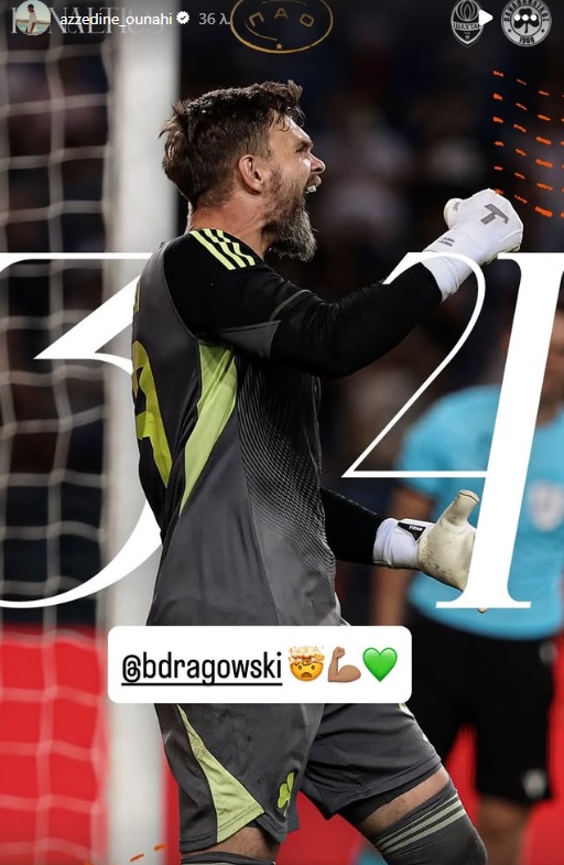 Ο Μαροκινός μέσος, που δεν αποκλείεται να επιστρέψει στο «τριφύλλι», μετά τη νίκη επί της Σαχτάρ στα πέναλτι ανέβασε ένα story στο Instagram αποθεώνοντας τον Μπαρτολομιέι Ντραγκόφσκι που έπιασε δύο πέναλτι. Μάλιστα ο άσος της Μαρσέιγ πόσταρε και μια πράσινη καρδιά, με ό,τι αυτό μπορεί να σημαίνει.