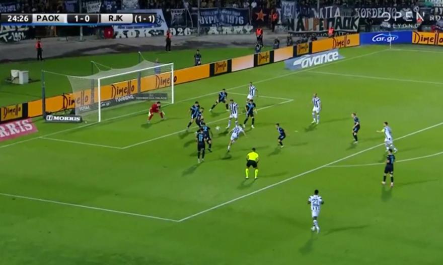 Μετά την καρφωτή κεφαλιά του Μεϊτέ στο 12ο λεπτό, οι Θεσσαλονικείς χτύπησαν ξανά τη Ριέκα, αυτή τη φορά στο 25' με τρομερή ατομική ενέργεια του Κωνσταντέλια!