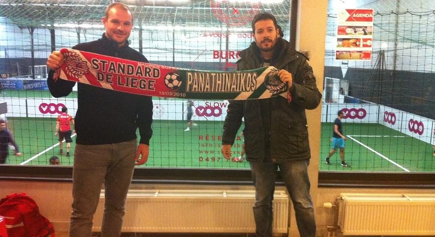 Ο Γάλλος πρώην αμυντικός μέσος, που, μάλιστα, ήταν αντίπαλος του Παναθηναϊκού, φορώντας τη φανέλα της Σταντάρ, στα παιχνίδια του 2010, για το Europa League, αμέσως χαμογέλασε μόλις άκουσε ότι είμαστε από την Ελλάδα, ως απεσταλμένοι για να καλύψουμε την αναμέτρηση και φέρνοντας από το γραφείο του ένα κασκόλ (όπως βλέπετε και στη φωτογραφία) από εκείνη την αναμέτρηση του πρόσφατου παρελθόντος, δέχθηκε να απολάυσει μαζί μας ένα ζεστό ρόφημα και να μας μιλήσει.