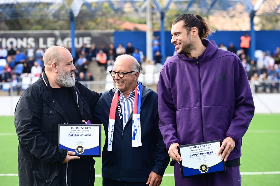 Παράλληλα, σε ένδειξη αναγνώρισης, οι νησιώτες πρόσφεραν αναμνηστική πλακέτα στον αντιπρόεδρο της ΠΑΕ Ολυμπιακός, Κώστα Καραπαπά, καθώς ήταν η πρώτη φορά που οι νταμπλούχοι Ελλάδας ταξίδεψαν στη Σύρο για επίσημη αναμέτρηση απέναντι σε ομάδα της Super League 2.