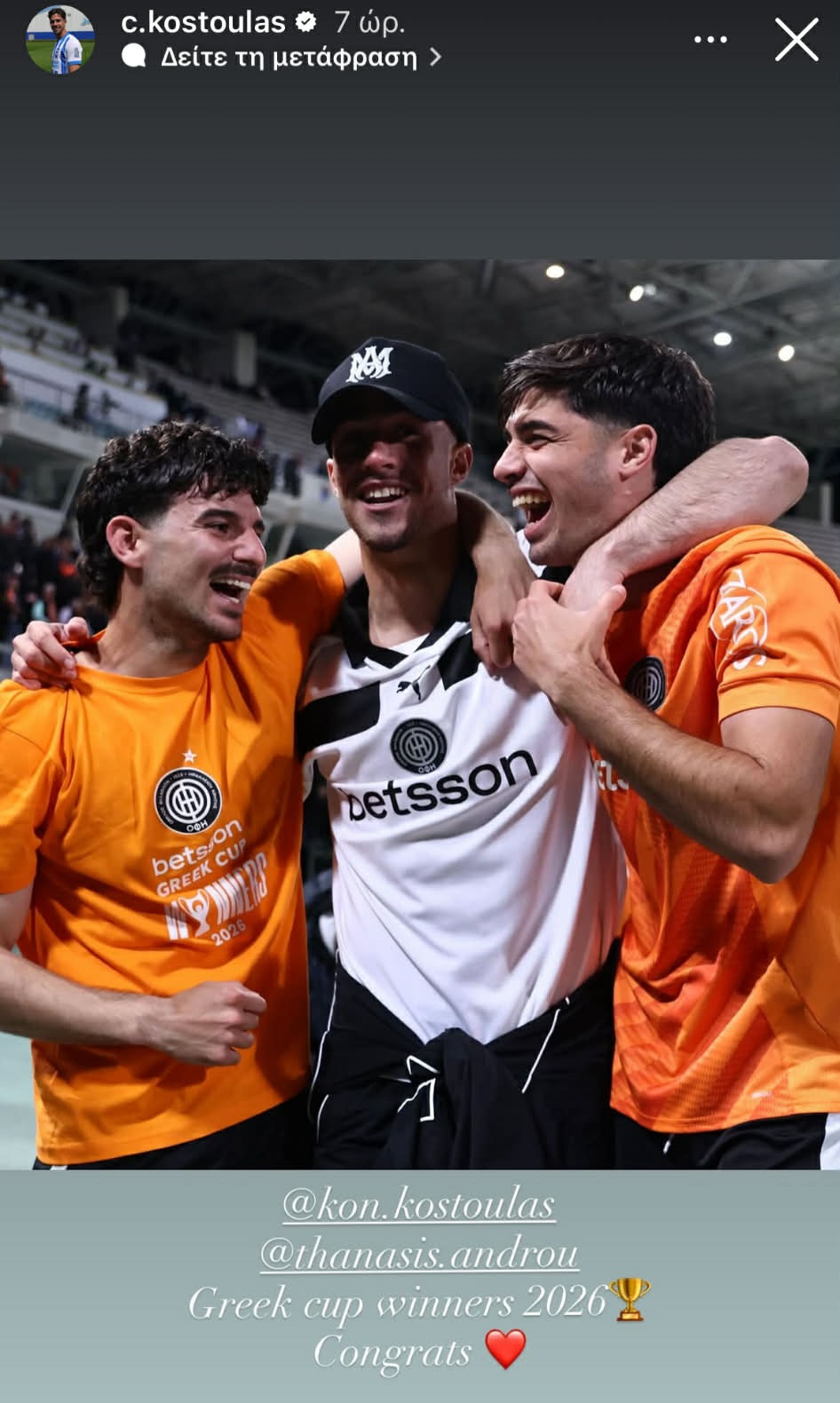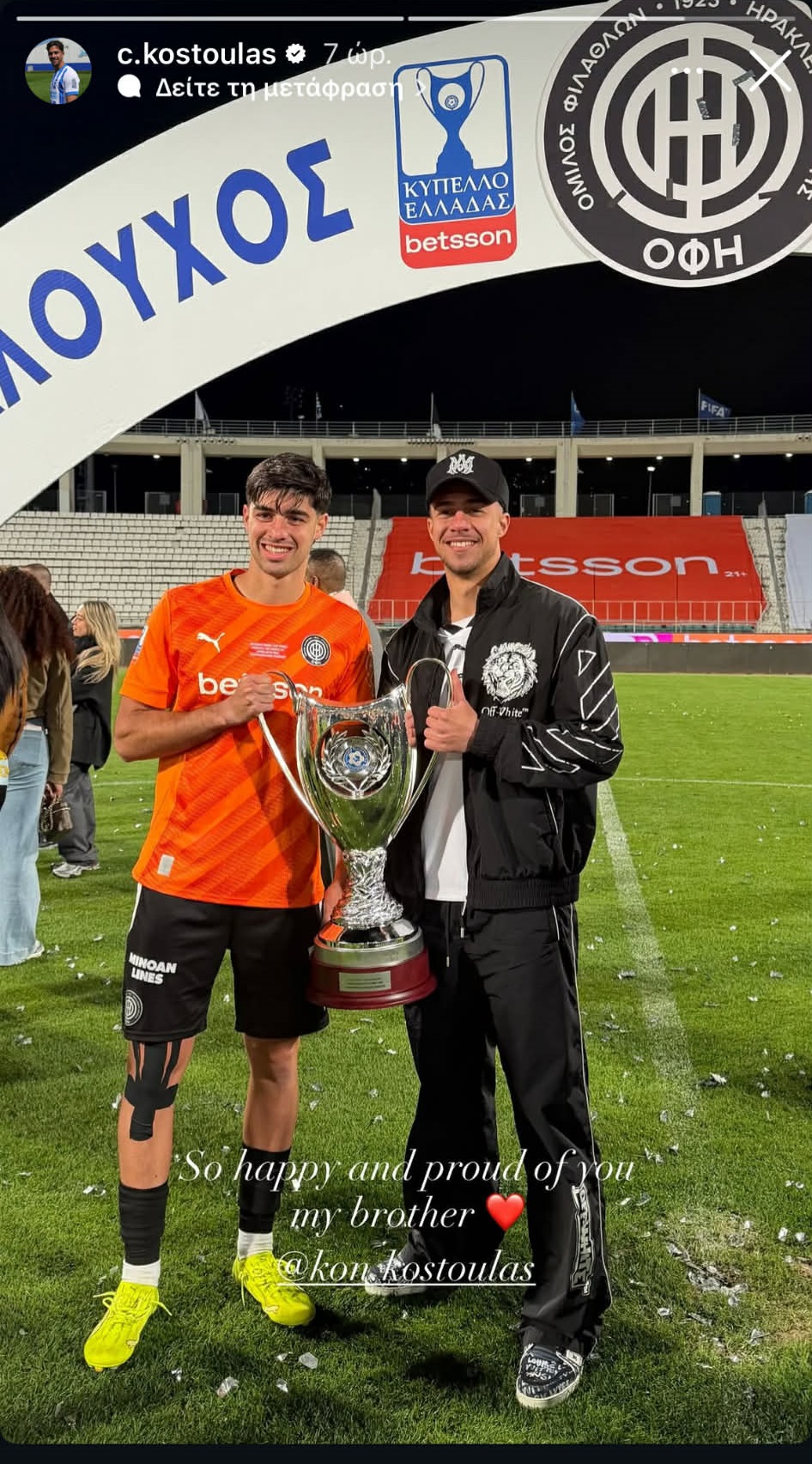 «Υπερήφανος και χαρούμενος για τον αδερφό μου», έγραψε ο Κωστούλας, ενώ το πανηγύρισε και με άλλον έναν ποδοσφαιριστή που διατηρεί εξαιρετικές σχέσεις, τον Θανάση Ανδρούτσο.