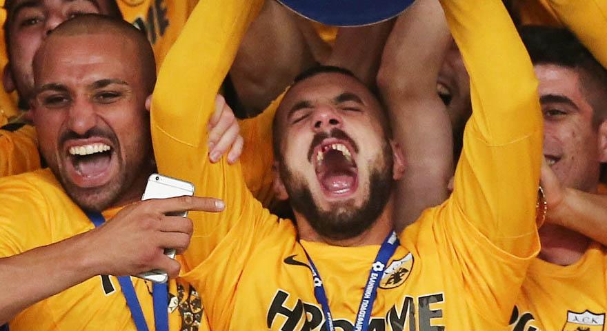 Παρά το ατύχημα ο παίκτης της ΑΕΚ δεν έχασε το χαμόγελο του και γιόρτασε με την ψυχή του την κατάκτηση του κυπέλλου από την ΑΕΚ.