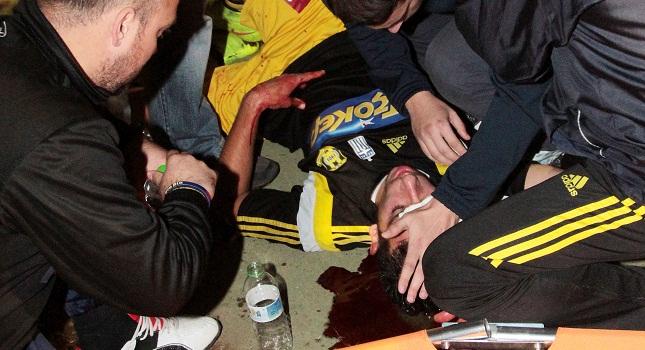 Στην προσπάθειά του χτύπησε δυνατά το κεφάλι του σε σίδερο που βρισκόταν εκεί, με αποτέλεσμα να τραυματιστεί, πέφτοντας αιμόρφυρτος στο γήπεδο. Αμέσως, διακομίσθηκε σε κοντινό νοσοκομείο όπου του παρασχέθηκαν οι πρώτες βοήθειες και έγιναν ράμματα.