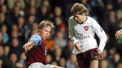 Ούτε στο «Βίλα Παρκ» έκανε στάση το τρένο της Άρσεναλ. Οι «κανονιέρηδες», αν και βρέθηκαν πίσω στο σκορ, επικράτησαν με 2-1 της Άστον Βίλα και διατήρησαν τη διαφορά ασφαλείας που έχουν στην κορυφή της Premiership. Οι «χωριάτες», που προέρχονταν από τέσσερις συνεχείς νίκες, προηγήθηκαν στο 14’ με κοντινό σουτ του Γκάρντνερ έπειτα από σέντρα του Κάριου που απομακρύνθηκε ασθενώς από την άμυνα των φιλοξενουμένων. Η απάντηση των παικτών του Αρσέν Βενγκέρ, που είχαν την υπεροχή σε όλο το πρώτο μέρος, ήρθε στο 23’ με τον Φλαμινί, που με κοντινό σουτ έπειτα από όμορφη συνεργασία των Αντεμπαγιόρ και Εμπουέ ισοφάρισε. Στο 36’ η Άρσεναλ σημείωσε το γκολ της νίκης με κεφαλιά του Αντεμπαγιόρ έπειτα από σέντρα του Σανιά. Στην επανάληψη οι γηπεδούχοι πίεσαν, είχαν την κατοχή της μπάλας, αλλά το αποτέλεσμα δεν άλλαξε, με συνέπεια οι Λονδρέζοι να φτάσουν τους 36 βαθμούς, πέντε περισσότερους από την Τσέλσι (που έχει ένα παιχνίδι περισσότερο) και έξι από τη Μάντσεστερ Γιουνάιτεντ.