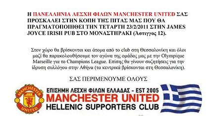 Την Τετάρτη 23 Φεβρουαρίου 2011, οι οπαδοί της μεγαλύτερης ομάδας του πλανήτη που ζούμε στην Αθήνα, θα κάνουμε την πρώτη σοβαρή και οργανωμένη μας προσπάθεια να ενώσουμε τις δυνάμεις μας. Και είμαστε πολλοί. Πάρα πολλοί! Απλά όλα αυτά τα χρόνια μας έλειπε η οργάνωση. Kάτω από την σκέπη λοιπόν του τελευταίου αναγνωρισμένου club της Manchester United στην Ευρώπη που βρίσκεται στην Θεσσαλονίκη, θα προσπαθήσουμε να οργανωθούμε και να λειτουργήσουμε με τον τίτλο: Manchester United Hellenic Supporters Club Athens Branch (Πανελλήνια Λέσχη Φίλων Manchester United Παράρτημα Αθηνών).