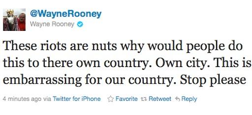 Δραματική έκκληση για να σταματήσουν τα επεισόδια που γίνονται στο Λονδίνο κι άλλες βρετανικές πόλεις προκαλώντας τραυματισμούς και φθορές περιουσιών απηύθυνε ο Γουέιν Ρούνεϊ μέσα από τη σελίδα του στο «Twitter».