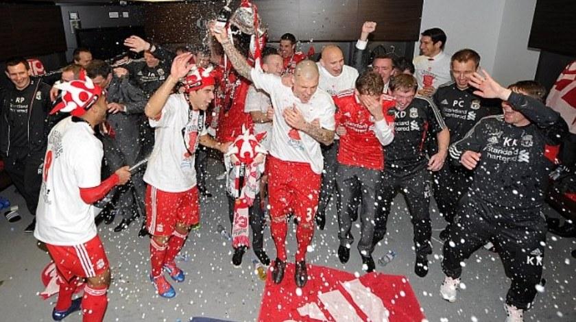 Πρώτος στους πανηγυρισμούς ο αρχηγός Στίβεν Τζέραρντ, ενώ και ο ιδιοκτήτης της ομάδας, Τζον Χένρι έδωσε το «παρών» στα αποδυτήρια του «Γουέμπλεϊ».