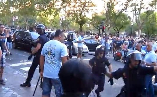 Τα όργανα ασφαλείας αντιδρούν επιτιθέμενα με γκλομπ στους Βρετανούς εκδρομείς αφότου κάποιος τους καταβρέχει με μπίρα, ενώ ένας εξ αυτών δέχεται δυνατό χτύπημα και πέφτει στο έδαφος.