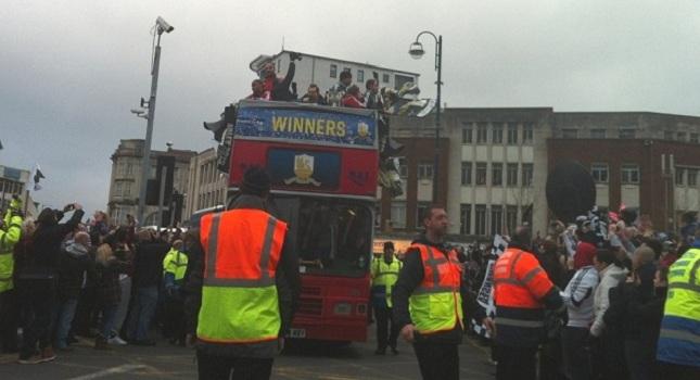 Η «βόλτα» με το ανοιχτό λεωφορείο ξεκίνησε από το «Dragon Hotel» και κατέληξε στο «Guildhall», όπου ο Πολ Λάμπερτ πήρε το μικρόφωνο και ευχαρίστησε από καρδιάς τους φίλους της ομάδας που τη στήριξαν και στο «Γουέμπλεϊ» και την υποδέχτηκαν με θέρμη στην επιστροφή από το Λονδίνο.