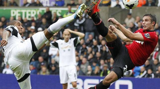 Όσο καλά κι αν ξεκίνησε στο παιχνίδι η Σουόνσι, βλέποντας το εις βάρος της 2-0 στον φωτεινό πίνακα, στο φινάλε του πρώτου ημιχρόνου, αντιλήφθηκε ότι δεν αρκούσε η προσπάθεια που κατέβαλε. Οι «κύκνοι» προσπάθησαν να επιβληθούν στον αγωνιστικό χώρο, αλλά ανησύχησαν πρώτοι στο 8ο λεπτό με το εκπληκτικό δεξί σουτ του Τζόουνς που απομάκρυνε ο Βορμ. Δέκα λεπτά αργότερα, ο Γκιγκς σούταρε άουτ από πλάγια θέση και το «Liberty» ξεσηκώθηκε στην αμέσως επόμενη φάση. Το γκολ του Μίτσου, όμως, ακυρώθηκε σωστά για οφσάιντ του Ντάιερ στην αρχή της φάσης. Οι «κόκκινοι διάβολοι» δεν είχαν… διάθεση να ρισκάρουν και είπαν να τελειώσουν το ματς με συνοπτικές διαδικασίες. Στο 34’ από απίστευτη μπαλιά του Γκιγκς, ο Φαν Πέρσι με μαγική κίνηση άνοιξε το σκορ και στο 36’ από ασίστ του Βαλένσια, ο Γουέλμπεκ έκανε πανεύκολα το 2-0.