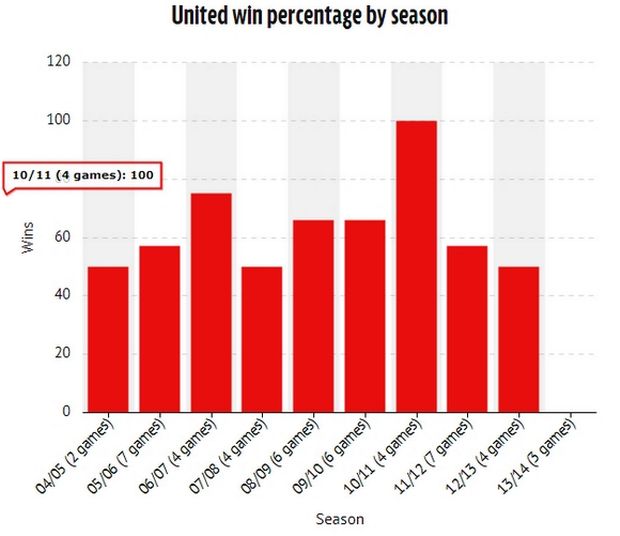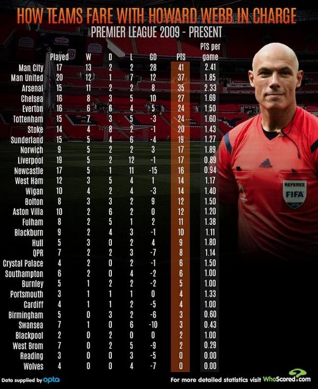Το όνομα του Χάουαρντ Γουέμπ είχε συνδεθεί από πολλούς με τους «κόκκινους διαβόλους». Μάλιστα, όταν το 2014 αποφάσισε να αποσυρθεί από την ενεργό δράση έγιναν διάφορα αφιερώματα σε Μέσα από το Νησί. Όπως η «Mirror» που παρουσίασε τη στατιστική του Γουεμπ με την ομάδα του Φέργκιουσον, που είχε 61.7% νίκες σε 47 παιχνίδια, καθώς σε 10 σεζόν έχασαν 12 φορές. Ωστόσο, σε μία μόλις σεζόν έκανε το απόλυτο με τον Γουέμπ η Γιουνάιτεντ, το 2010-11. Στις άλλες κάπου στραβοπατούσε, αλλά είχε ποσοστό επιτυχίας μεγαλύτερο του 50%. Για τους… λάτρεις της στατιστικής, ο Χάουαρντ Γουέμπ στα 47 ματς της Γιουνάιτεντ, τα οποία διεύθυνε, έδωσε επτά πέναλτι υπέρ της και μόλις ένα σε βάρος της.