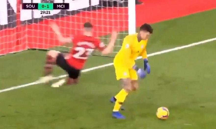 Ο τερματοφύλακας της Μάντσεστερ Σίτι «έσκασε» ντρίπλα στον Χόλμπεργκ της Σαουθάμπτον σχεδόν πάνω στη γραμμή της εστίας του με το ματς στο 0-1 (υπέρ των «Πολιτών»).
