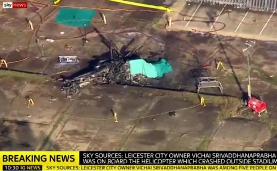 Η αεροφωτογραφία που κυκλοφορεί το πρωί της Κυριακής από τα απομεινάρια του ελικοπτέρου, το οποίο έχει συγκλονίσει το ποδόσφαιρο από το βράδυ του Σαββάτου με την πτώση του στο πάρκινγκ έξω από το γήπεδο της Λέστερ, είναι τέτοια που δεν αφήνει και πολλές ελπίδες για επιβίωση των επιβαινόντων.