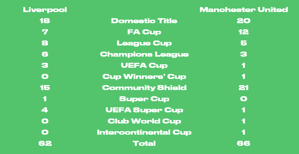 Συνολικά οι δύο σύλλογοι έχουν πλέον 128 τρόπαια, μετά τη χθεσινή επιτυχία της Λίβερπουλ επί της Τσέλσι στα πέναλτι για το ευρωπαϊκό Super Cup, με τη Γιουνάιτεντ να έχει 66 και την ομάδα του Κλοπ 62.