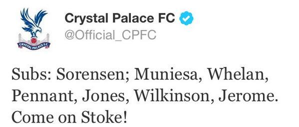 Στην εκτός έδρας αναμέτρηση της Κρίσταλ Πάλας με τη Στόουκ, ο επίσημος λογαριασμός Twitter των φιλοξενουμένων μετά την αναφορά στις συνθέσεις των ομάδων έγραψε «Come on Stoke!».