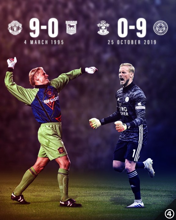 Τότε, πριν 14 χρόνια, στο τέρμα της θριαμβεύτριας Γιουνάιτεντ καθόταν ο τρομερός Πέτερ Σμάιχελ. Χθες, τα γκολπόστ της Λέστερ «επιτηρούσε» ο γιος του Κάσπερ! Πατέρας και γιος, εκτός του ότι κατέκτησαν την Πρέμιερ Λιγκ, μοιράζονται πλέον και το ρεκόρ για το μεγαλύτερο σκορ σε αγώνα της κορυφαίας κατηγορίας.