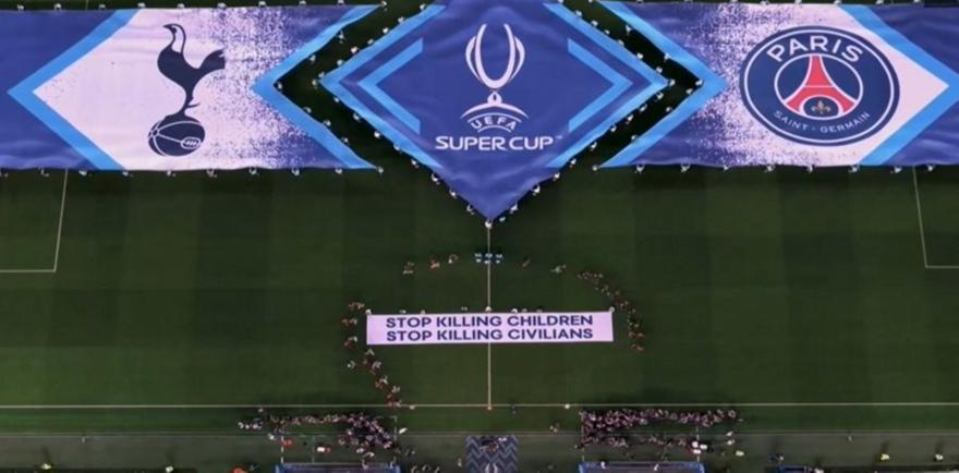 Η Τότεναμ «μονομαχεί» με τη Παρί Σεν Ζερμέν στο Ούντινε για το Super Cup, με τους ποδοσφαιριστές των δύο ομάδων να κάνουν την είσοδο τους στον αγωνιστικό χώρο με ένα πανό που έγραφε: «Σταματήστε να σκοτώνετε παιδιά, σταματήστε να σκοτώνετε αμάχους»