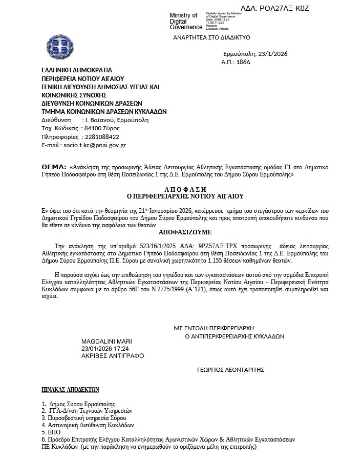 «Εν όψει του ότι κατά την θεομηνία της 21ης Ιανουαρίου 2026, κατέρρευσε τμήμα του στεγάστρου των κερκίδων του Δημοτικού Γηπέδου Ποδοσφαίρου του Δήμου Σύρου Ερμούπολης και προς αποτροπή οποιουδήποτε κινδύνου που θα έθετε σε κίνδυνο της ασφάλεια των θεατών…