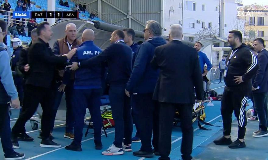 Διασώστες του ΕΚΑΒ μπήκαν στον αγωνιστικό χώρο, με το μέλος της ΑΕΛ να δέχεται τις πρώτες βοήθειες και με το παιχνίδι να συνεχίζεται κανονικά.
