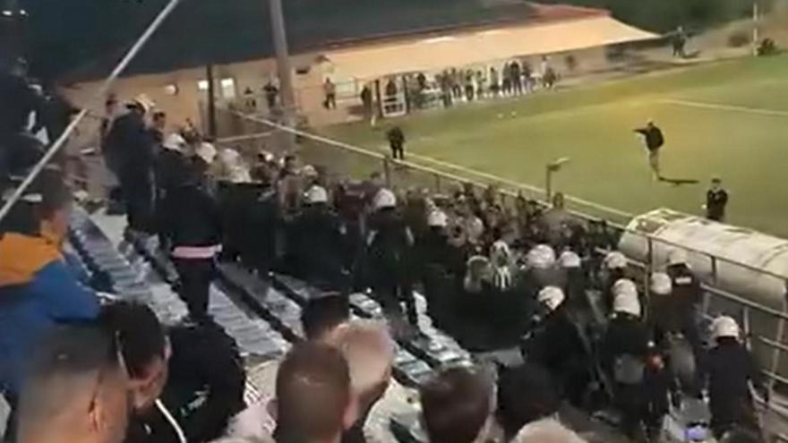 Σύμφωνα με μαρτυρίες, η ένταση ξεκίνησε όταν οπαδοί του Παναιγιάλειου άρχισαν να πετούν μπουκάλια μετά την ήττα της ομάδας τους. Η Αστυνομία αντέδρασε δυναμικά, ανεβαίνοντας στις κερκίδες για να ελέγξει την κατάσταση.