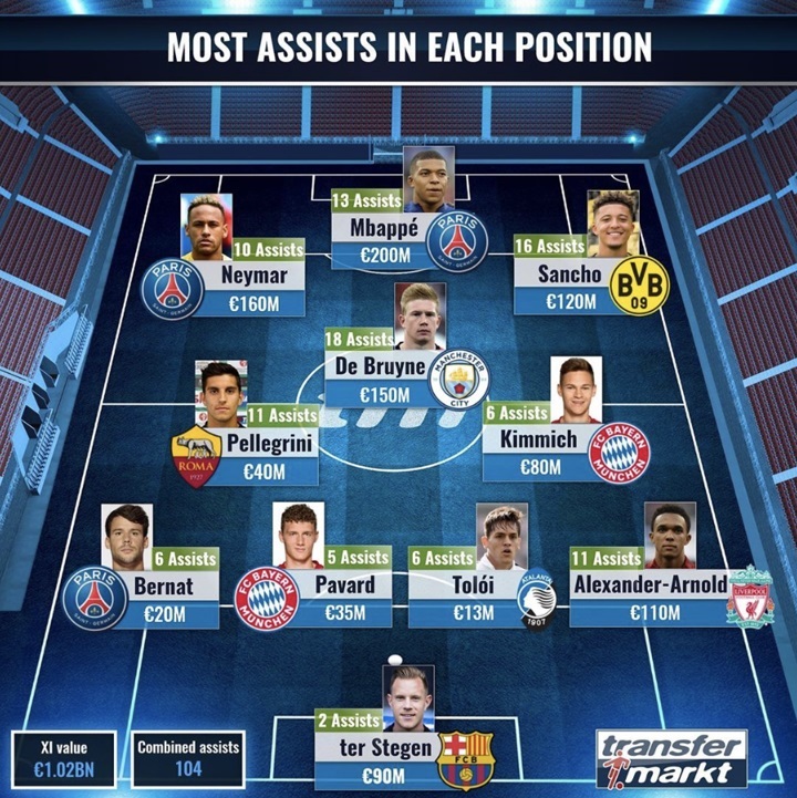 Τερματόφυλακας ο Τερ Στέγκεν με 2 (!) ασίστ παρακαλώ, ενώ στην τετράδα της άμυνας βρίσκονται οι Άρνολντ (11), Τολόι (6), Παβάρ (5) και Μπερνάτ (6). Στην τριάδα του άξονα βρίσκονται οι Κίμιχ (6), Πελεγκρίνι (11), Ντε Μπρόινε (18), ενώ οι Σάντσο (16), Νεϊμάρ (10) πλαισιώνουν τον Εμπαπέ (13) στην επίθεση.
