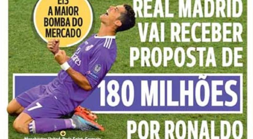 Άφησε για λίγο στην άκρη τις ομάδες της χώρας της και αποφάσισε να ασχοληθεί με το αστέρι της, Κριστιάνο Ρονάλντο. Ο λόγος για την πορτογαλική εφημερίδα «A Bola» που στο σημερινό της πρωτοσέλιδο και στο πρώτο της θέμα αναφέρει πως: «Η Ρεάλ Μαδρίτης θα δεχτεί πρόταση 180 εκατ. ευρώ για τον Ρονάλντο», ενώ τονίζει πως πρόκειται για τη «μεγαλύτερη βόμβα στην αγορά».