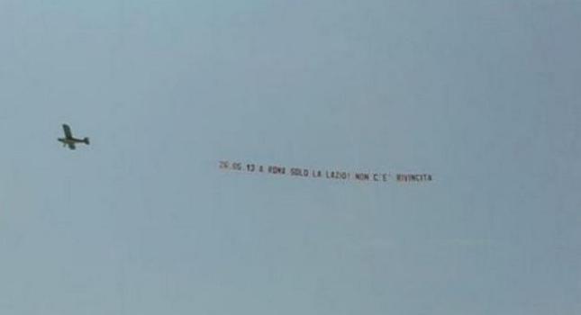 Δεν έχει περάσει άλλωστε αρκετός καιρός από την… κηδεία των «τζιαλορόσι» που έκαναν οι «λατσιάλι» στους δρόμους της «αιώνιας πόλης». Φαίνεται, όμως πώς αυτό δεν ήταν αρκετό για τους οπαδούς της Λάτσι. Αυτή τη φορά αποφάσισαν να «χτυπήσουν» από… αέρα, καθώς στην ουρά ενός αεροπλάνου είχαν δέσει ένα τεράστιο πανό, το οποίο έγραφε: «26-05-13. Στη Ρώμη υπάρχει μόνο η Λάτσιο! Δεν υπάρχει εκδίκηση».