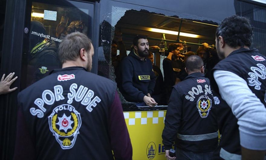 Συγκεκριμένα, άγνωστοι επιτέθηκαν σε δύο πούλμαν που μετέφεραν οπαδούς των φιλοξενούμενων, με αποτέλεσμα να σπάσουν τα τζάμια, ωστόσο σύμφωνα με τον Τύπο της Τουρκίας δεν έχουν αναφερθεί τραυματίες.