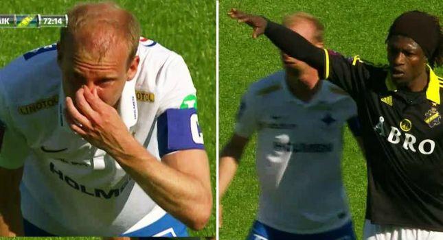 Ο 33χρονος αμυντικός της Νόρκεπινγκ σε μια ανύποπτη φάση έπεσε πάνω στον αγκώνα του επιθετικού της ΑΪΚ, προκαλώντας τα γέλια όσων είχαν αντιληφθεί τι συνέβη.