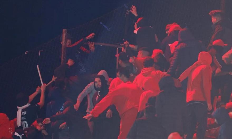 Τα «αίματα» άναψαν, όταν μερίδα φιλοξενούμενων οπαδών προσέγγισαν αυτούς της Ιντεπεντιέντε πετώντας χειροβομβίδες κρότου-λάμψης και μπουκάλια.
