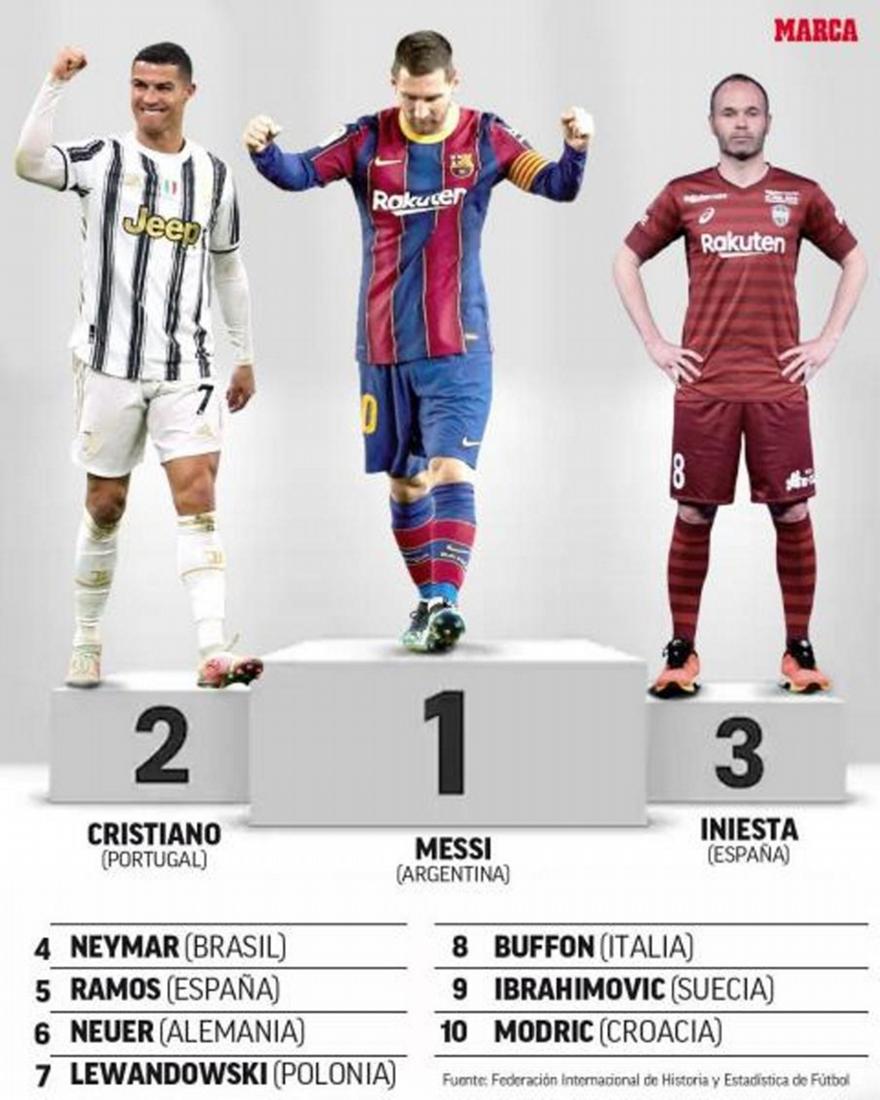 Η Διεθνής Ομοσπονδία Ιστορίας και Στατιστικής Ποδοσφαίρου επέλεξε τους δέκα κορυφαίους ποδοσφαιριστές από το 2010 μέχρι το 2020 και στην κορυφή βρίσκεται ο Λιονέλ Μέσι, δεύτερος ακολουθεί ο Κριστιάνο Ρονάλντο και τρίτος ο Αντρές Ινιέστα.