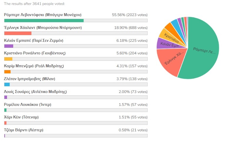 Ο Πολωνός επιθετικός συγκέντρωσε το 55,54% των ψήφων, με τον Έρλινγκ Χάαλαντ να έρχεται δεύτερος με μόλις 18,87% και τον Κιλιάν Εμπαπέ τρίτο, πολύ πιο πίσω, με 6,19%.