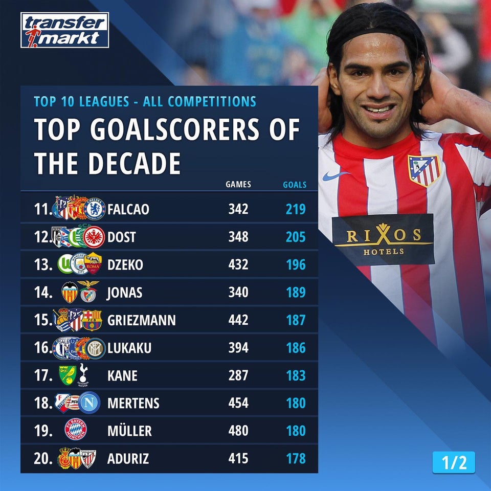Κορυφαίος σκόρερ στην δεκαετία που ολοκληρώνεται ήταν ο Λιονέλ Μέσι. Το transfermarkt μέτρησε τις επιδόσεις στο σκοράρισμα που είχαν σε όλες τις διοργανώσεις οι παίκτες που αγωνίζονται στα δέκα κορυφαία πρωταθλήματα και ο Αργεντινός σταρ της Μπαρτσελόνα ξεχώρισε ξανά.