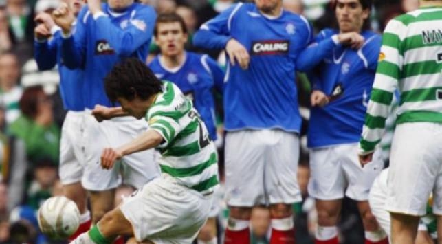 Ο πρώην παίκτης της Σέλτικ έστησε τη μπάλα, πήρε φόρα, εκτέλεσε με φάλτσο και σημάδεψε εύστοχα, «γκρεμίζοντας» τη μινιατούρα του ζευγαριού.