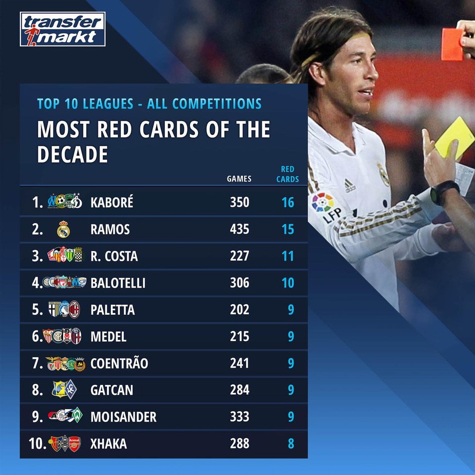 Ο Σαρλ Καμπορέ «κέρδισε» την πρώτη θέση στη λίστα των παικτών με τις περισσότερες κόκκινες κάρτες στην δεκαετία που ολοκληρώθηκε πριν λίγες ώρες. Ο μέσος της Ντιναμό Μόσχας από την Μπουρκίνα Φάσο αποβλήθηκε 16 φορές σε 350 ματς αφήνοντας δεύτερο τον Σέρχιο Ράμος, ο οποίος δέχτηκε 15 κόκκινες σε 435 εμφανίσεις.