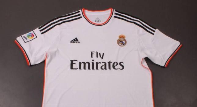 Η πρώτη φανέλα της Ρεάλ Μαδρίτης θα είναι η παραδοσιακή άσπρη, με πορτοκαλί τελειώματα στο λαιμό, στα μανίκια και στα πλάγια.