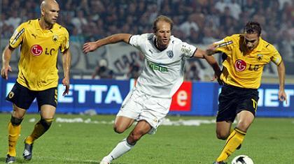 Οι επιθετικές προσπάθειες των Θεσσαλονικιών έγιναν, ως επί το πλείστον, από τα άκρα. Άσχετα αν το γκολ και οι δυσκολότερες καταστάσεις στην περιοχή του Σάχα προήλθαν από τον άξονα. Οι Κονσεϊσάο και Βιειρίνια πήραν πρωτοβουλίες, επιχειρώντας να ανοίξουν κενούς χώρους και να πασάρουν στα κεντρικά χαφ που ήταν ανενόχλητα. Ως εκεί όμως… Τίποτα από όσα προσπάθησαν οι Πορτογάλοι δεν έπιασε τόπο. Αντίθετα, αρκούσε μια κάθετη πάσα-τρύπα του Βερόν. Ο Αργεντινός έβγαλε μόνο του τον Μουσλίμοβιτς και εκείνος με τη σειρά του πλάσαρε εξαιρετικά τον Σάχα στο 15’. Αυτομάτως το παιχνίδι άνοιξε... Οι αλληλοκαλύψεις των ΠΑΟΚτζήδων δούλεψαν άψογα, εγκλώβισαν την ΑΕΚ στη μεσαία γραμμή και μάλιστα έβγαιναν πρώτοι στην μπάλα και εκδήλωναν αντεπιθέσεις.