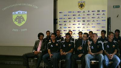 Με ιδιαίτερη λαμπρότητα πραγματοποιήθηκε το μεσημέρι της Τρίτης η παρουσίαση των έντεκα νέων αποκτημάτων της ΑΕΚ στον πολυχώρο «Αθηναΐς» στο Γκάζι. Καθένα από τα νέα πρόσωπα της «Ένωσης» έπαιρναν θέση στο πάνελ καθώς και τη φανέλα που θα φορούν τη νέα σεζόν, αφού πρώτα προβάλλονταν σε γιγαντοοθόνη και υπό τους ήχους μουσικής στιγμιότυπα από την πορεία τους στη διάρκεια της προετοιμασίας της ΑΕΚ στο Κόνιε της Ιταλίας.