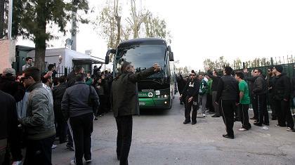 Μετά τους πανηγυρισμούς στο αεροδρόμιο για την πρόκριση επί της Ρόμα, περίπου 300 φίλοι του Παναθηναϊκού συγκεντρώθηκαν αυτή τη φορά στις εγκαταστάσεις της Παιανίας, για να στείλουν το μήνυμά τους πριν αναχωρήσει το πούλμαν για τη Νέα Σμύρνη.