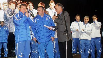 Οι διεθνείς κατέβηκαν με δυσκολία στον δρόμο που στην ειδική εξέδρα γνώρισαν την αποθέωση από τους χιλιάδες συμπατριώτες μας, με τα καπνογόνα να δημιουργούν εικόνα γηπέδου, ενώ η ιαχή «να τοι, να τοι οι πρωταθλητές» δονούσε την ατμόσφαιρα.