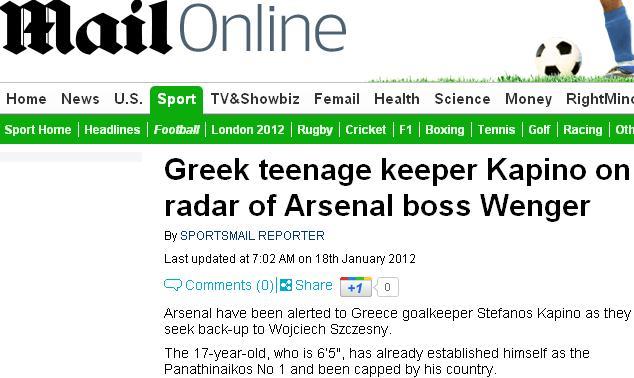 Στο μεταγραφικό στόχαστρο της Άρσεναλ έχει μπει ο Στέφανος Καπίνο, σύμφωνα με δημοσίευμα της «Daily Mail». Η αγγλική εφημερίδα αναφέρει πως «... ο 17χρονος τερματοφύλακας του Παναθηναϊκού έχει προσελκύσει το ενδιαφέρον της Άρσεναλ, που αναζητεί τη ρεζέρβα του Βόιτσεχ Σέζνι. Ήδη έχει καθιερωθεί στον Παναθηναϊκό κι έχει κληθεί στην Εθνική Ελλάδος» και προσθέτει: