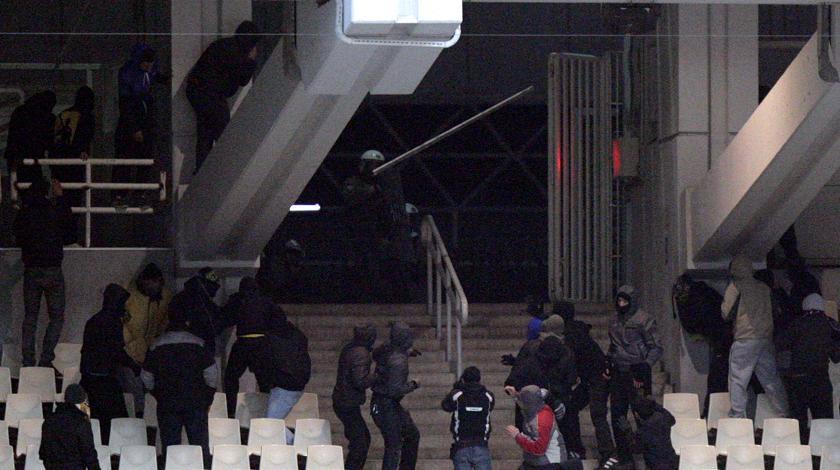 Εκεί, σε μία προσπάθεια να μεταβούν προς τις θέσεις των VIP και τα αποδυτήρια, εμποδίστηκαν από τα ΜΑΤ, τα οποία έκαναν χρήση δακρυγόνων και χειροβομβίδων κρότου-λάμψης.