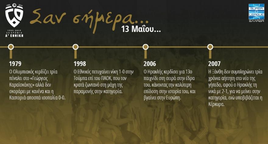 Ιστορική αναδρομή στη σημερινή ημέρα, 13 Μαΐου, κάνει η επίσημη ιστοσελίδα της Σούπερ Λίγκας.