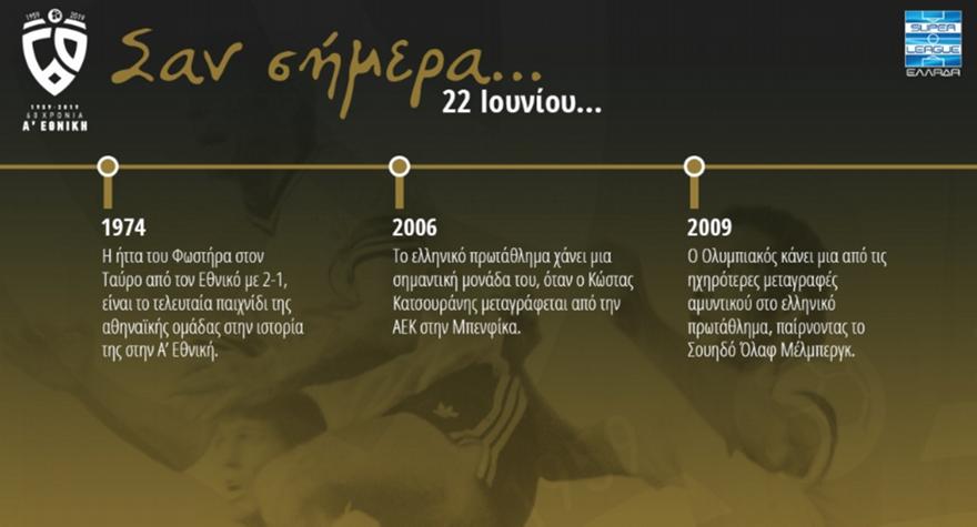Ιστορική αναδρομή στη σημερινή ημέρα, 22 Ιουνίου, κάνει η επίσημη ιστοσελίδα της Σούπερ Λίγκας.