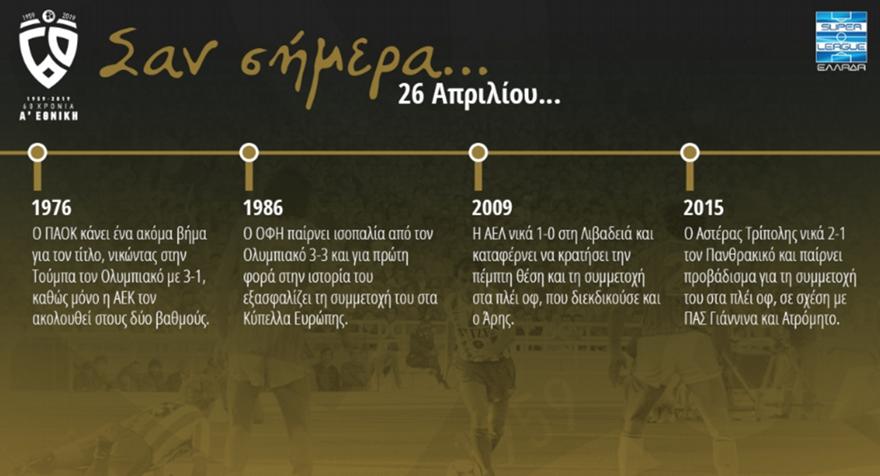 Ιστορική αναδρομή στη σημερινή ημέρα, 26 Απριλίου, κάνει η επίσημη ιστοσελίδα της Σούπερ Λίγκας.