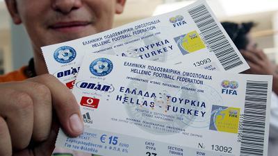 Στη διάθεση των φιλάθλων τίθενται από την Τρίτη (13/3) τα εισιτήρια του καθοριστικού αγώνα της 24ης Μαρτίου απέναντι στην Τουρκία για τα προκριματικά του Ευρωπαϊκού Πρωταθλήματος του 2008. Τα «μαγικά χαρτάκια» για την αναμέτρηση (Σάββατο, 21:30) θα γίνεται καθημερινά από τα εκδοτήρια του γηπέδου «Γ. Καραϊσκάκης» και της πλατείας Κοραή (ώρες 10:00-17:00). Κάθε ενδιαφερόμενος μπορεί να αγοράσει, με την επίδειξη αστυνομικής ταυτότητας ή διαβατηρίου, μέχρι δύο (2) εισιτήρια των 20, 35, και 50 ευρώ. Η διάθεση των εισιτηρίων του αγώνα θα γίνει αποκλειστικά σε Ελληνες φιλάθλους.