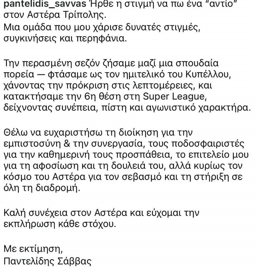 Ο Σάββας Παντελίδης θέλησε μέσα από τα social media να πει το δικό του αντίο στους Αρκάδες και ευχαρίστησε παράλληλα τόσο τους ποδοσφαιριστές του, όσο και τη διοίκηση και τους συνεργάτες του.