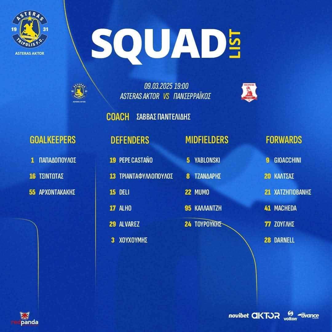 Γνωστή έγινε η αποστολή του Asteras AKTOR για το τελευταίο παιχνίδι της κανονικής διάρκειας της Super League κόντρα στον Πανσερραικό στην Τρίπολη (09/03, 19:00).